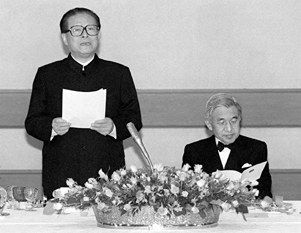 1998年11月26日,江泽民作为国宾访日,日本天王、皇后在王宫设晚宴招待,约150名政要、各行业领袖出席了晚宴。天王致欢迎辞时说:希望与中国携手解决面临的问题,为地球环境的改善、人类的福祉、世界和平继续做出贡献。对此,江在致辞时,始终紧綳面孔,并严厉地回应道:日本军国主义走上对外侵略扩张的错误道路,给中国人民和亚洲其他国家的人民带来极大灾难……我们要永远汲取沉痛的历史教训……
