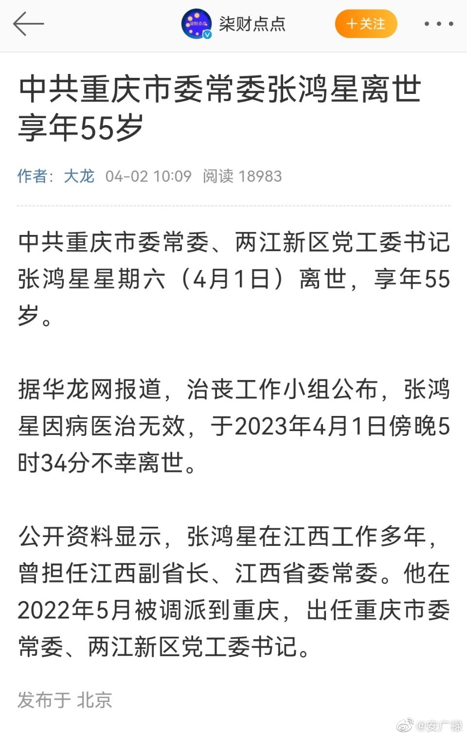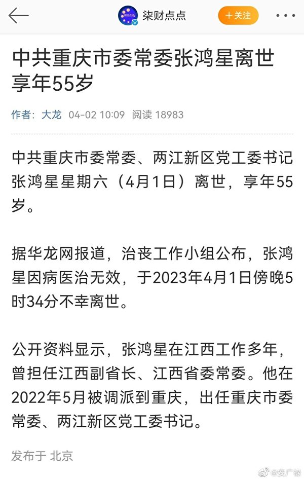 4月2日上午,重庆市张鸿星治丧工作小组发布讣告:中共重庆市委常委、两江新区党工委书记张鸿星因病医治无效,于2023年4月1日17时34分“不幸离世,享年55岁”。