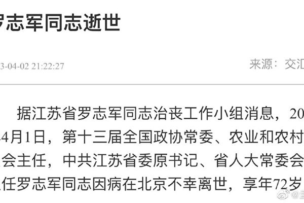 4月2日晚上,江苏省罗志军治丧工作小组发布讣告:2023年4月1日,第十三届全国政协常委、农业和农村委员会主任,中共江苏省委原书记、省人大常委会原主任罗志军因病在北京“不幸离世,享年72岁”。