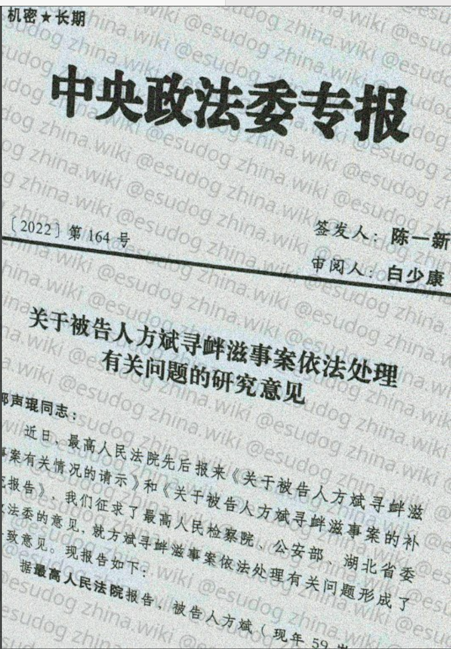 4月23日,海外推特广泛流传两份标注“机密+长期”的中共中央政法委文件和对方斌的判决书,显示方斌案及其他政治犯的处理手法都是“政治问题非政治化处理”,表明方斌案从一开始到判刑,均由中共中央政法委主导。