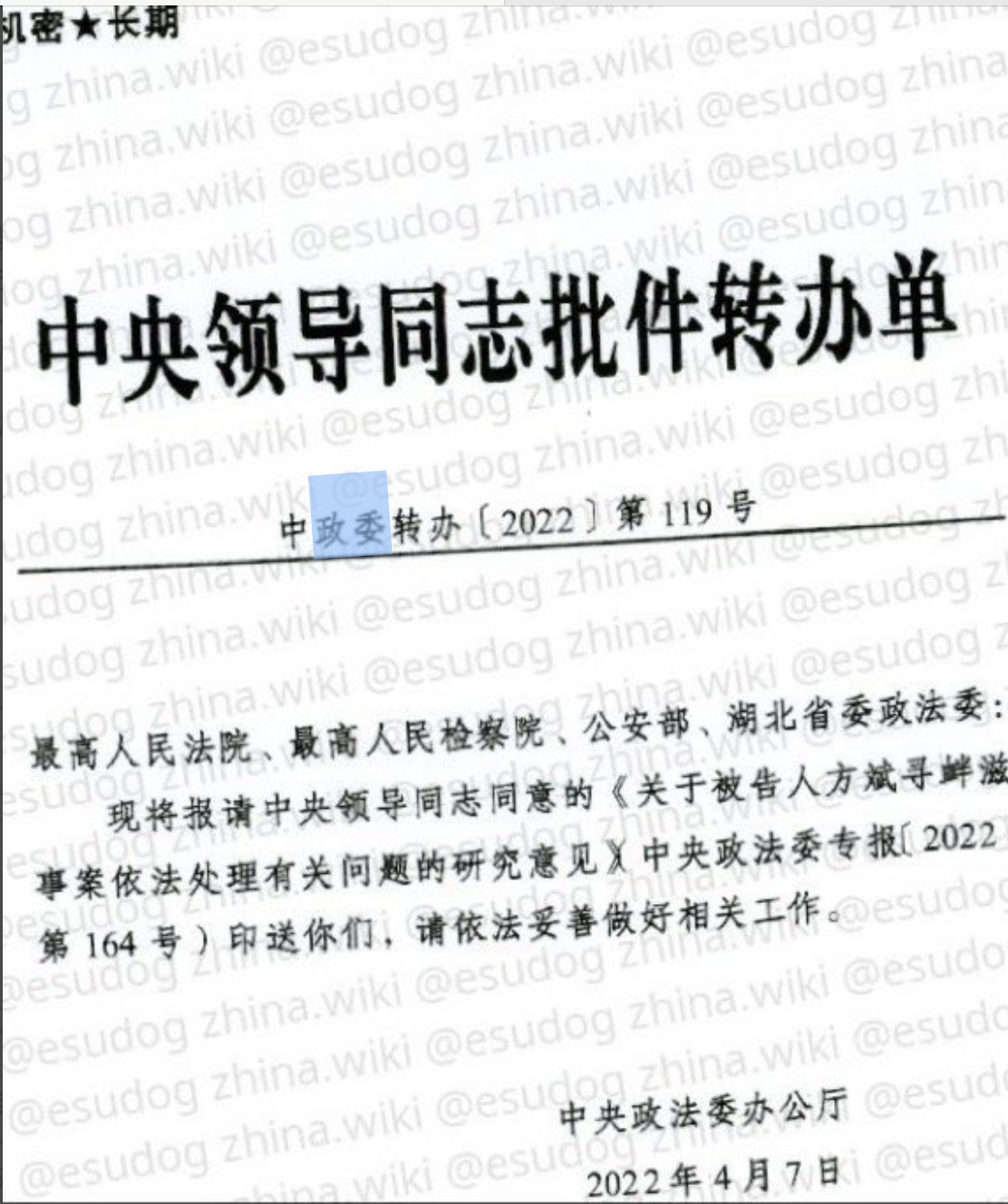 这份泄露的《中央政法委专报》显示,“关于被告人方斌寻衅滋事案依法处理有关问题的研究意见”,是中共中央政法委办公厅至最高法院、最高检察院、公安部以及湖北省委政法委的批示。该文件签发者为中共中央政法委委员陈一新,签发时间是2022年4月7日。