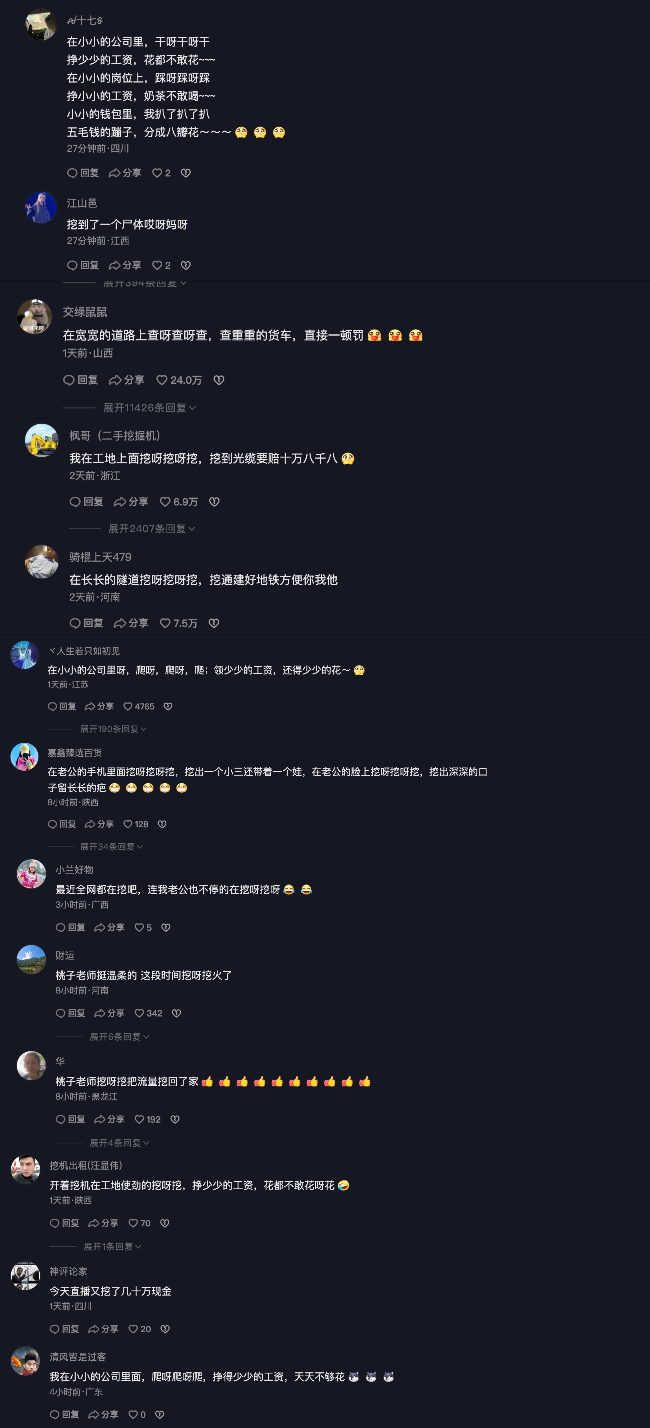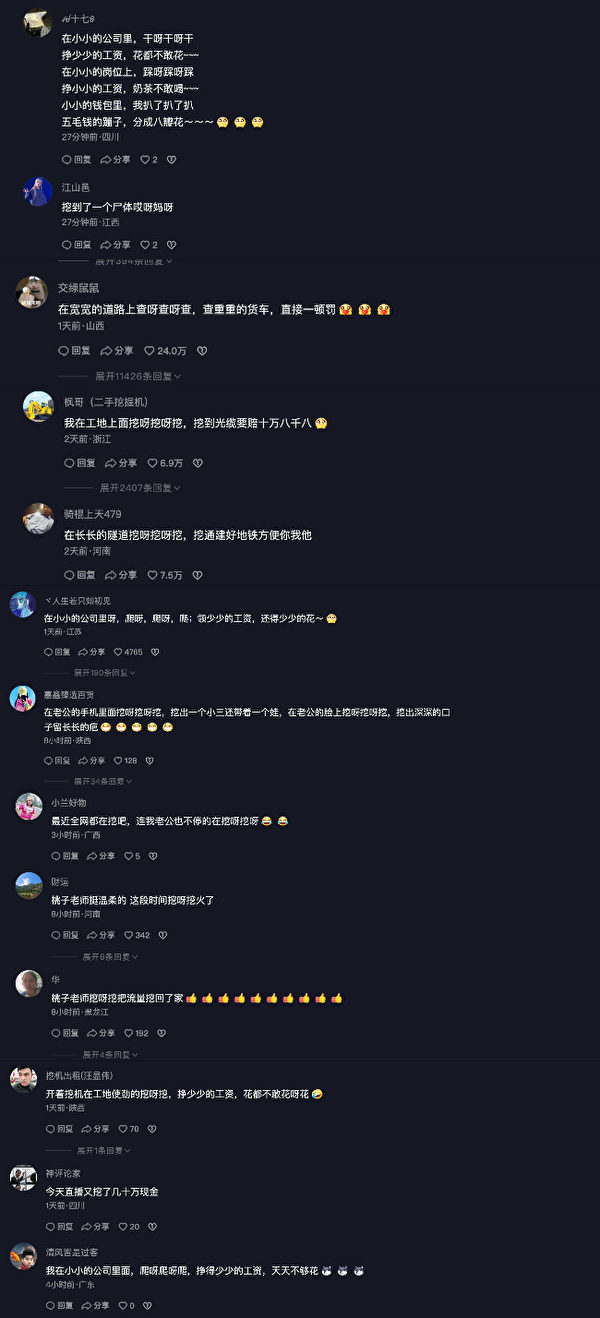 也有网民调侃中共权贵留言说,“中共高官挖呀挖呀挖,把中国人民的财富全都挖走啦!”