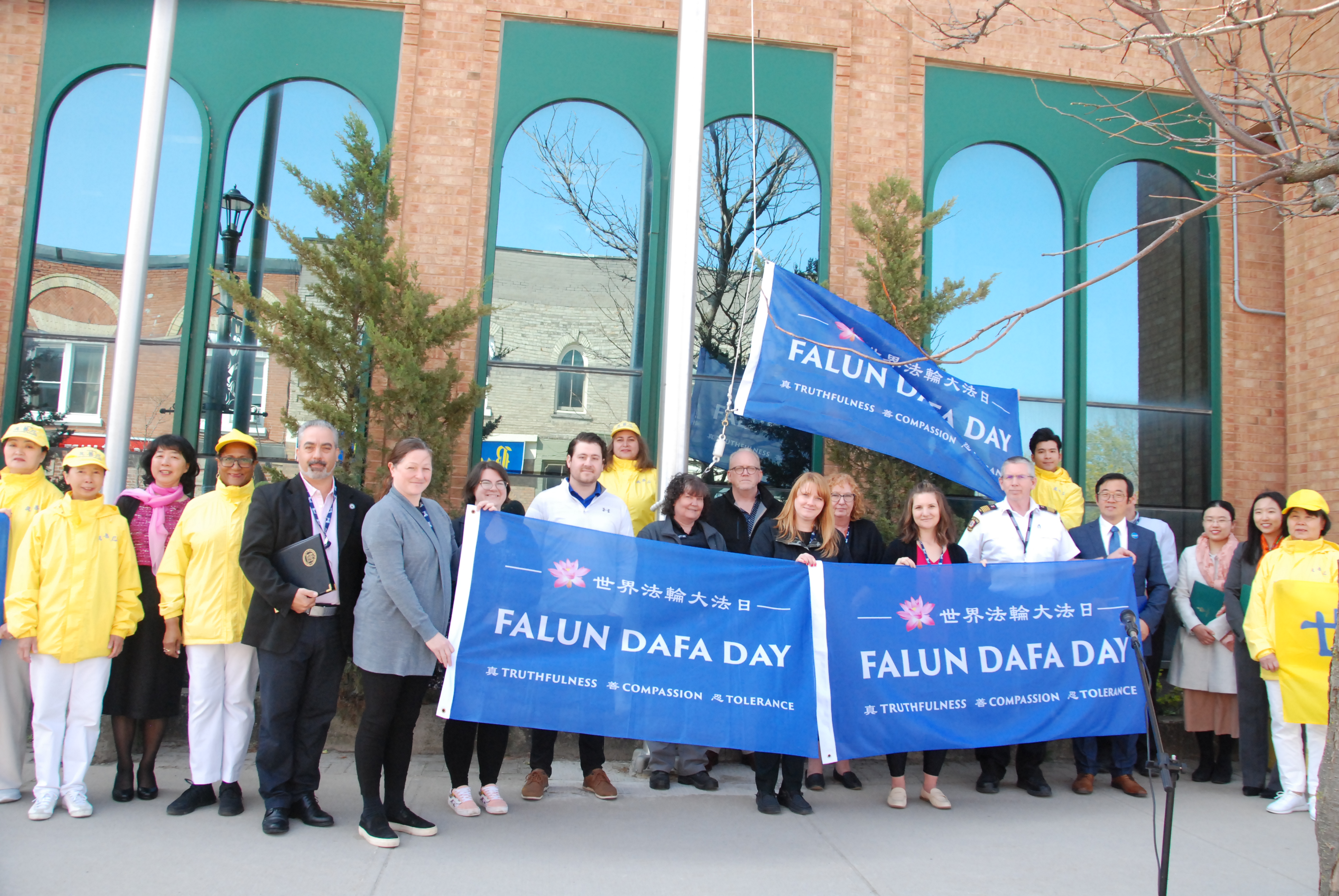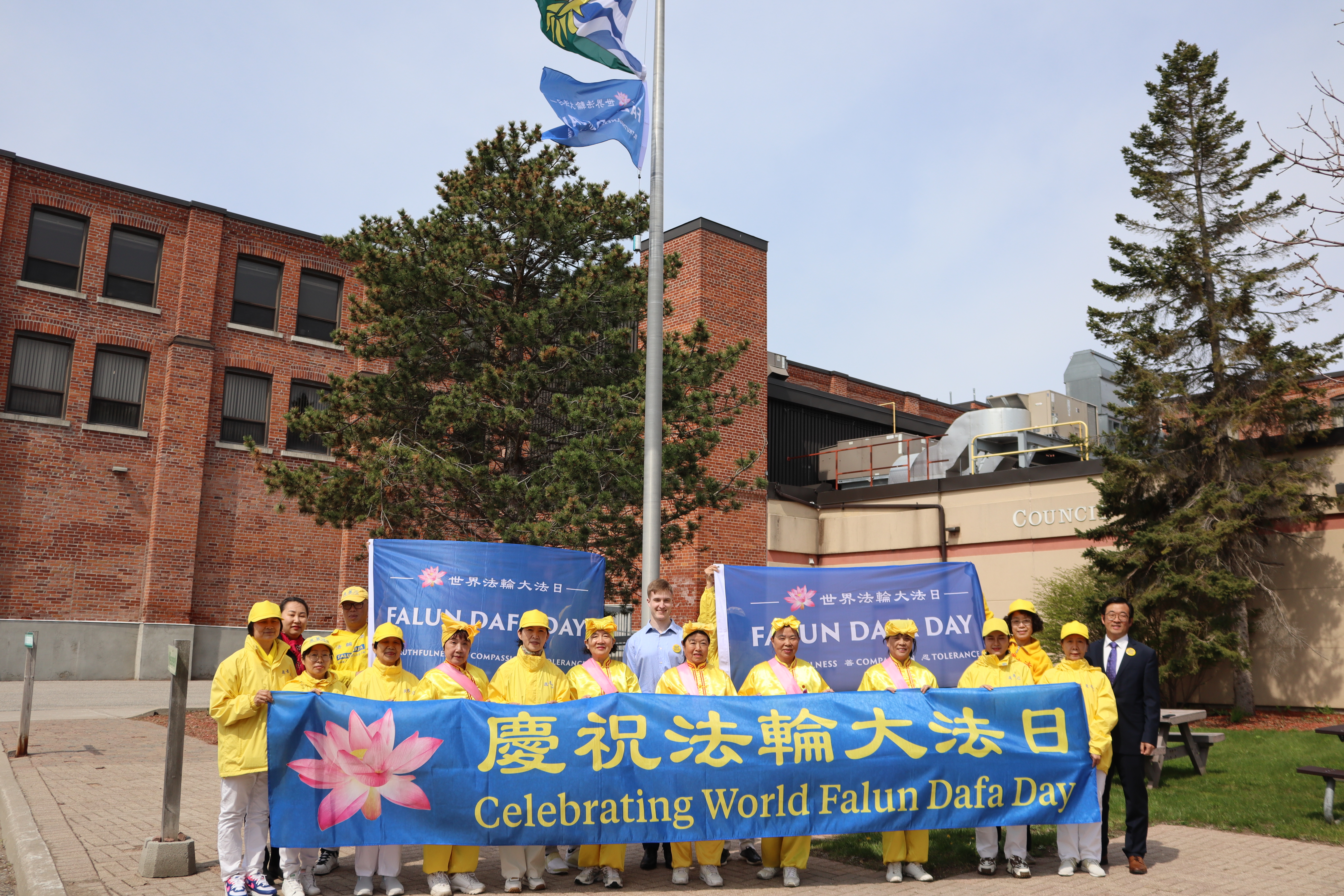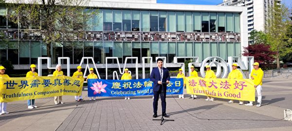 2023年5月11日,安省汉密尔顿市举行升旗仪式,并将于5月13日晚在城市标志建筑亮彩灯,以庆祝世界法轮大法日。