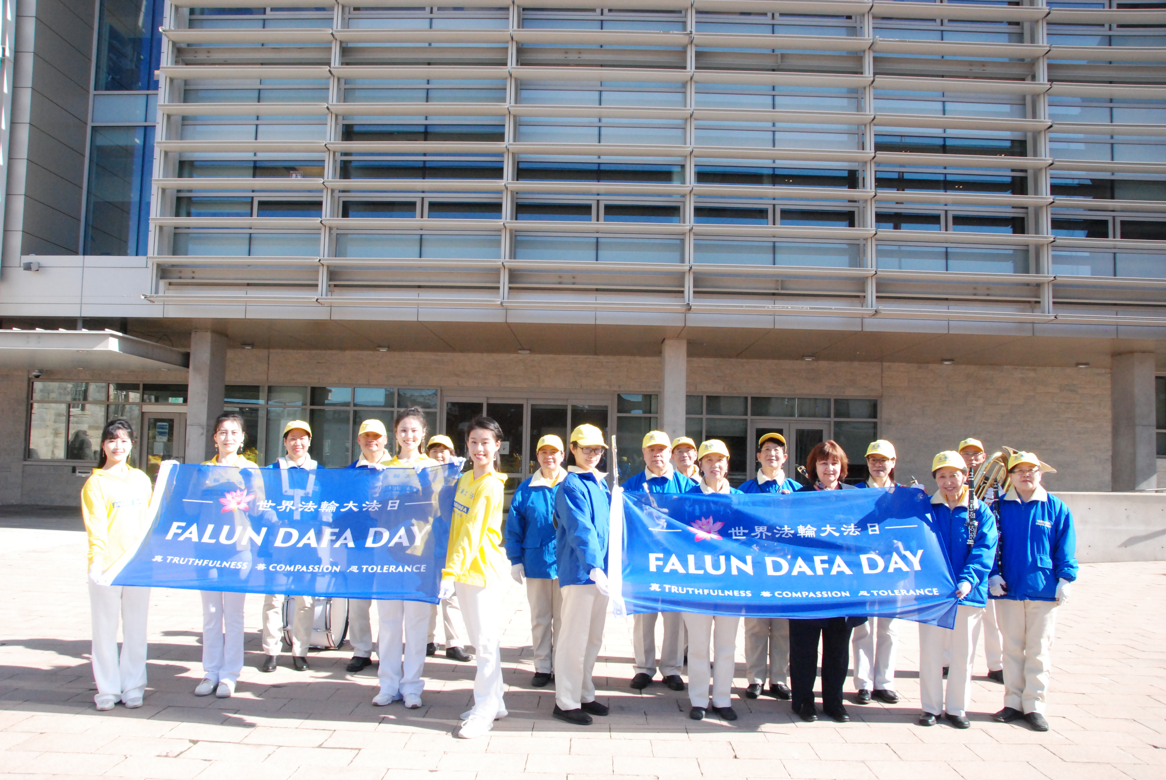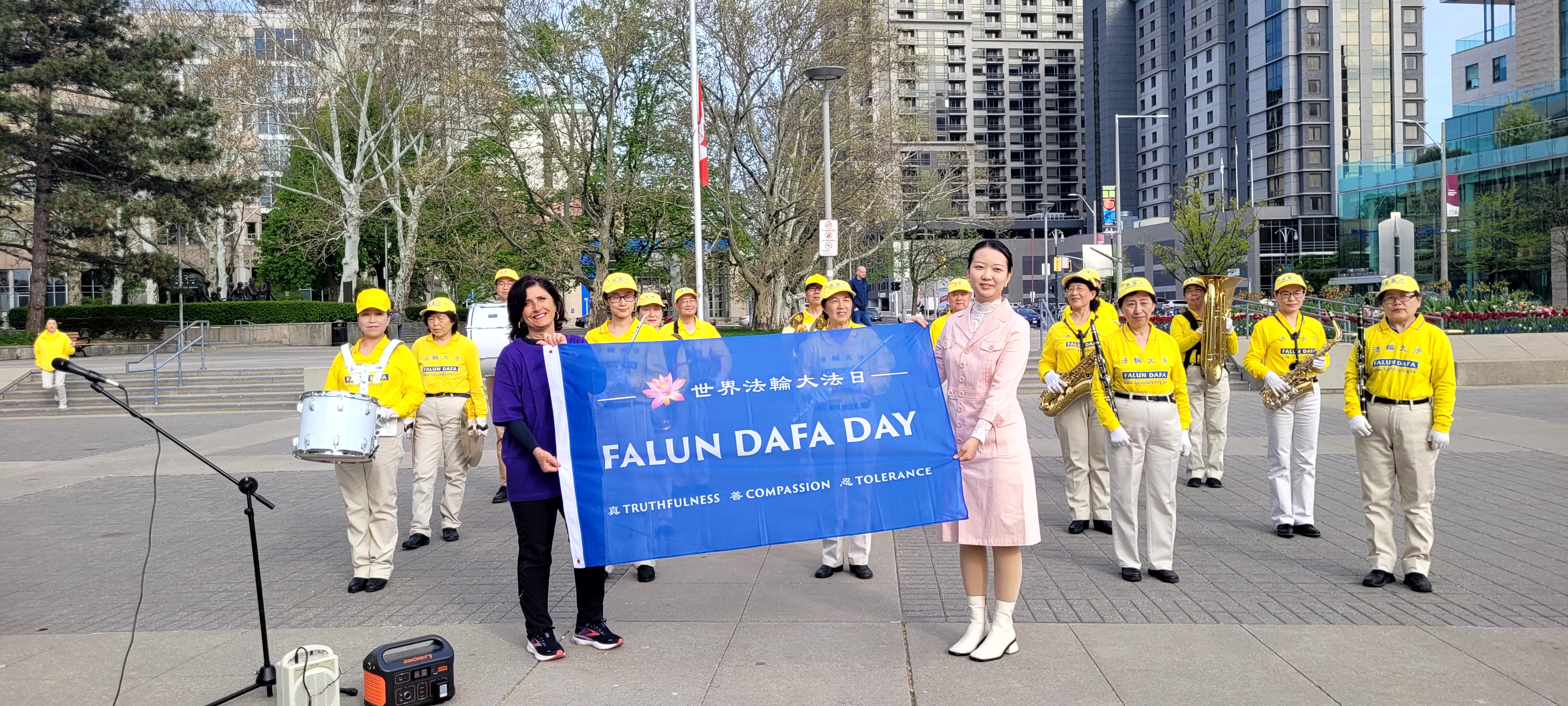 2023年5月8日上午,安省剑桥镇举行隆重的世界法轮大法日升旗仪式。在天国乐团演奏的优美的音乐声中,法轮大法日旗帜在剑桥镇市政广场升起。
