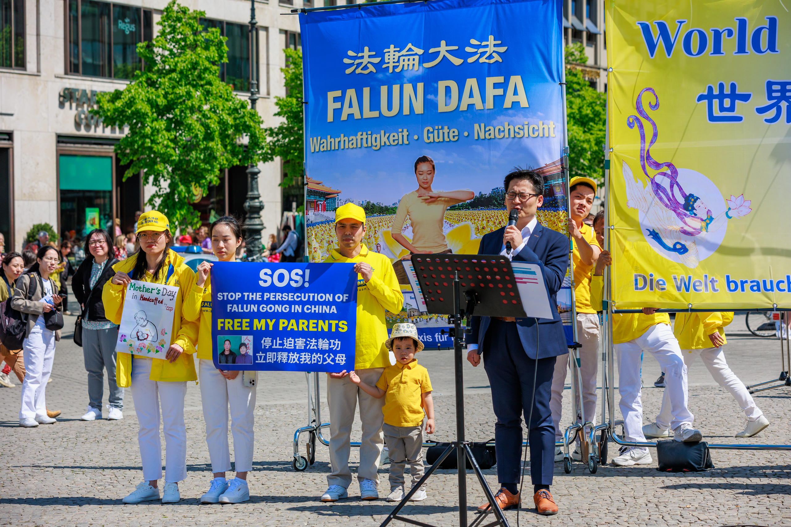 柏林著名景点前公开发言 呼吁营救父母