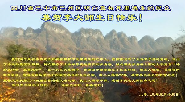 【大纪元2023年05月14日讯】(大纪元记者李洁思综合报导)在世界法轮大法日到来之时,大陆民众通过明慧网遥寄对李洪志大师的生日祝福,并感恩他的慈悲保护。