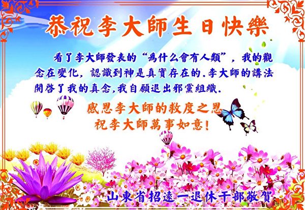 “感谢李洪志大师救命之恩!恭祝李大师生日快乐!法轮大法好、真善忍好!”