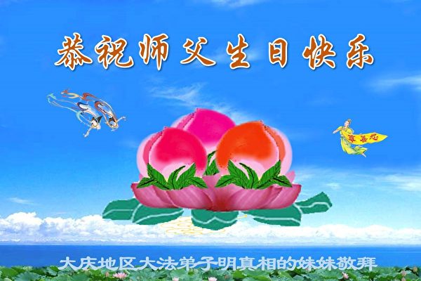“我们祝师父生日快乐!万事如意!盼师父快回国内,我们要学法轮功。”