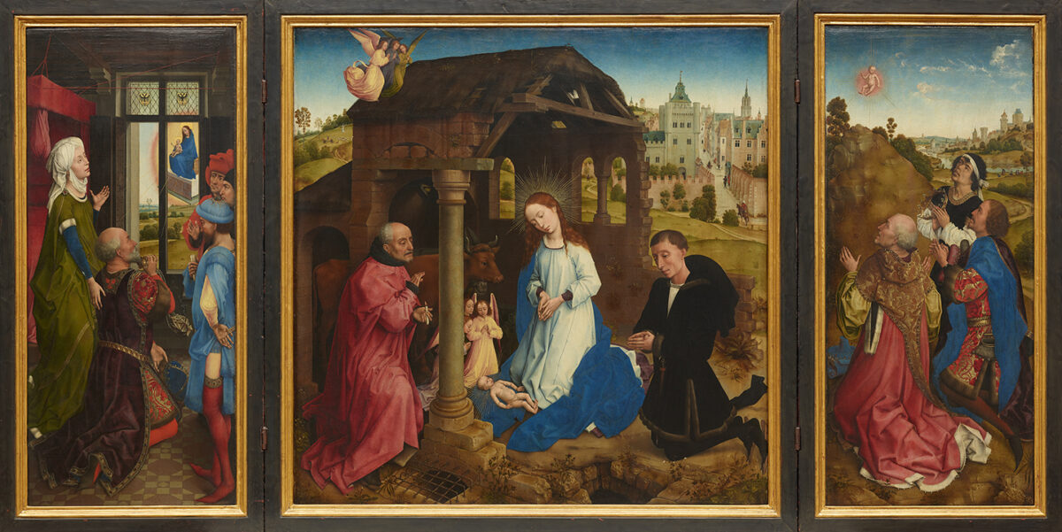 目前对凡‧德‧古斯的生平所知甚少。他的作品明显受到了布鲁塞尔大师罗希尔‧范德魏登(Rogier van der Weyden)的影响。范德魏登是当时极具影响力的画家,学者们普遍认为凡‧德‧古斯可能曾经在他的工作室担任学徒。这次展览中也包含了一幅范德魏登的重要作品《米德尔堡祭坛画》(Middelburg Altarpiece),这幅三联画也是柏林画廊的馆藏之一。这件作品的构图将圣母马利亚和耶稣安排在正中央,其他人物围绕在其周围。这样的安排方式在当时成为典范,在凡‧德‧古斯的祭坛画《耶稣诞生图》中也可以看到这样的手法。