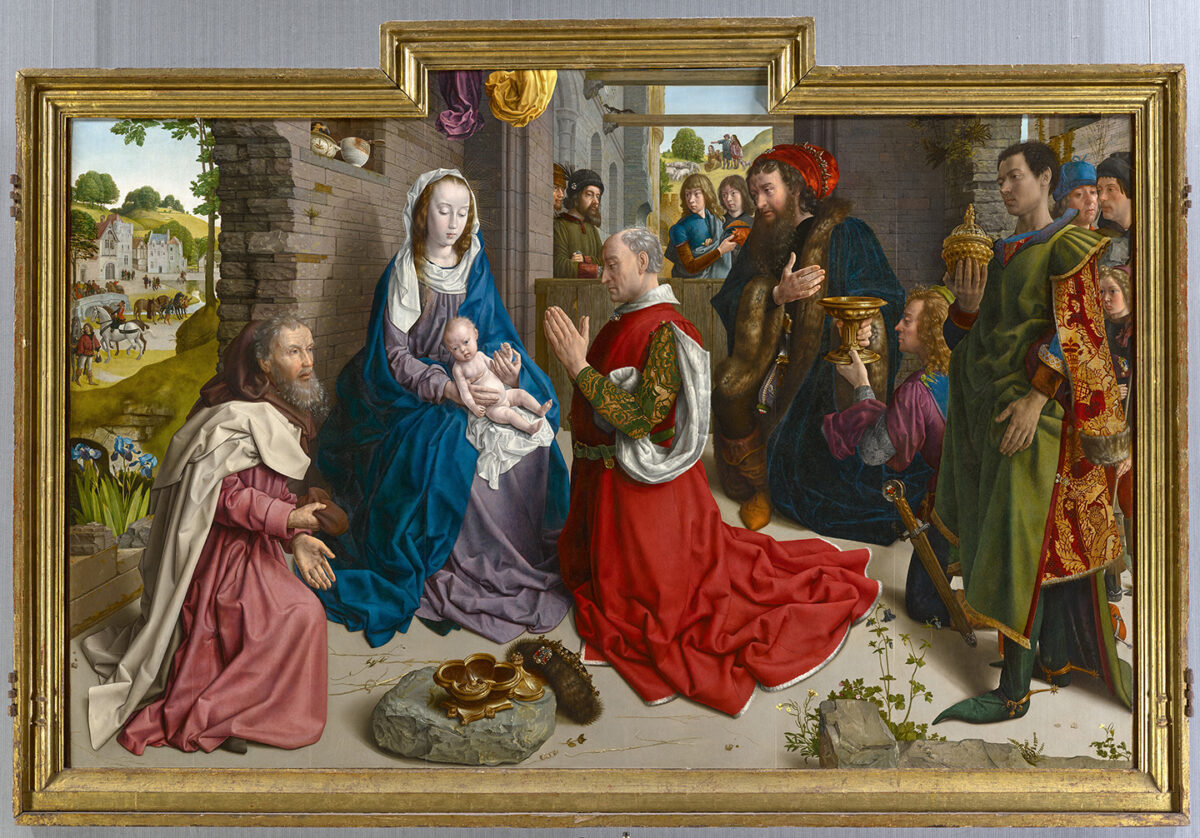 《蒙福尔特祭坛画》最初是一幅大型的三联画,然而现今只有中央的面板被切下而留存了下来。这幅画以相当动人、发人深省的方式描绘了东方三博士的朝拜。这是现存最重要的凡‧德‧古斯作品。马利亚坐在前面的石头上,这里曾是一座纪念建筑,现已成为废墟。她凝视着抱在膝上的圣婴,此时三位带着礼物的博士前来向他们致敬。