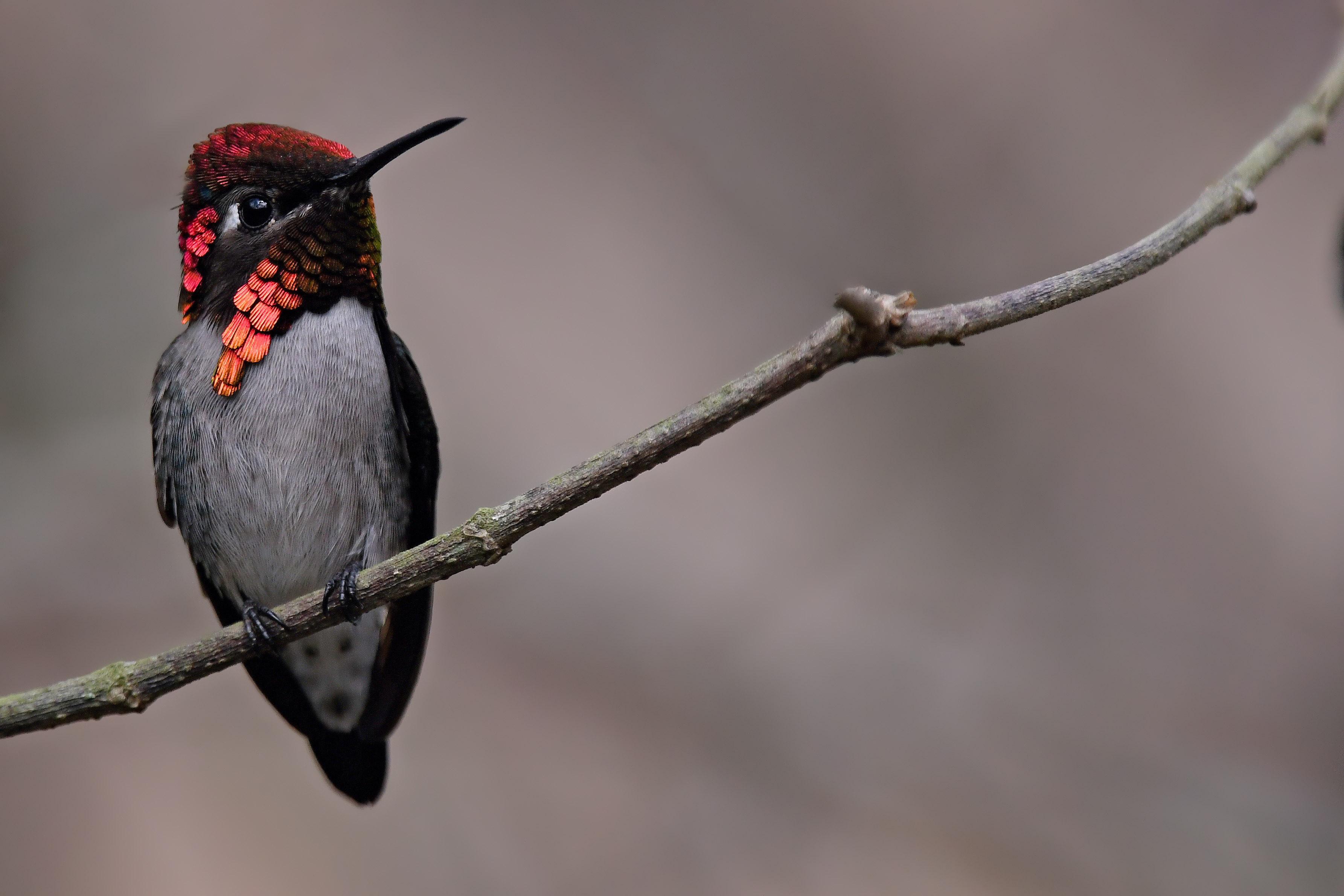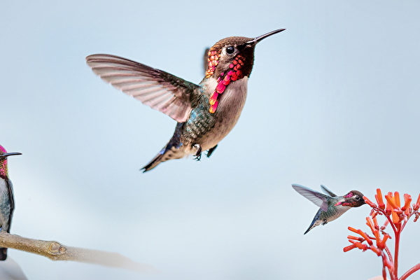 另外,吸蜜蜂鸟不仅拥有惊人的速度和飞行能力,而且外貌华美艳丽。雄性吸蜜蜂鸟的头部和颈部羽毛闪耀着金属红色,背部是青绿色,胸侧有火焰般闪亮的红宝石羽毛。雌性吸蜜蜂鸟则通体覆盖着绿宝石羽毛,腹部是灰色。
