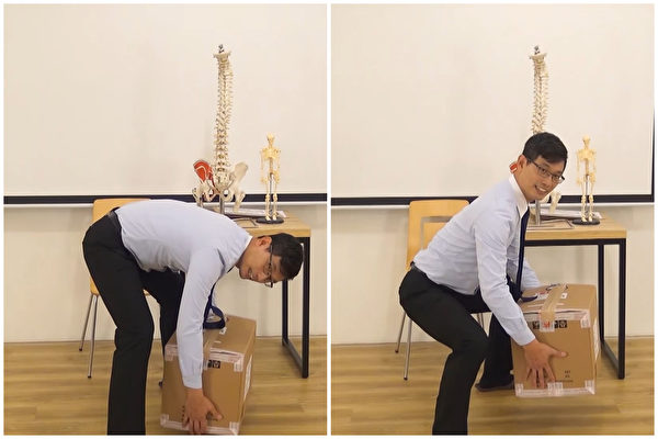 搬重物的正确动作,应该先曲髋,然后用臀、腿的力量搬起重物,而不是用腰部来施力。