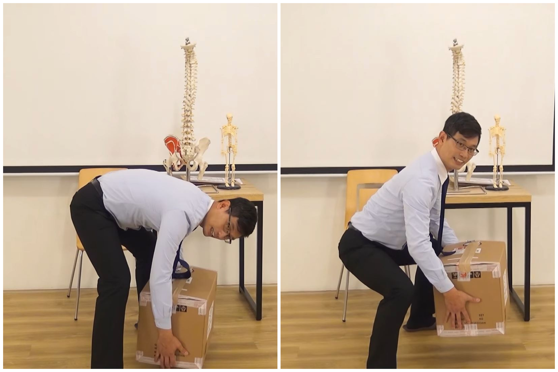 很多人习惯直接弯曲脊椎,将重物搬起来。弯腰本身就是一种伤害性的动作,它会让脊椎关节面呈现“前窄后宽”的状态,容易导致椎间盘突出。