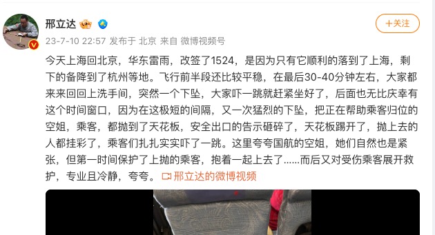 拥有621万微博粉丝的古生物学者、知名科学科普博主“邢立达”当时在该航班上。10日深夜,他在微博上发出视频描述整个过程。