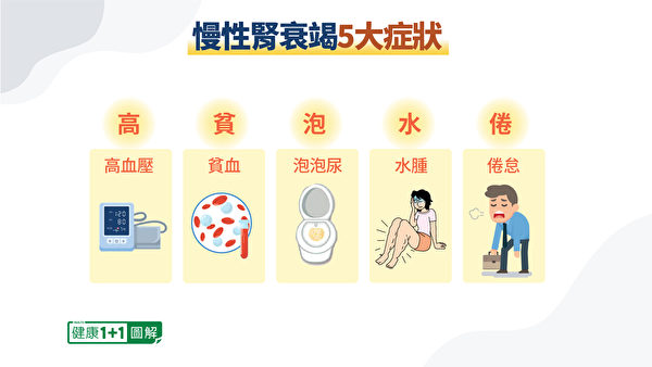 医学上常说肾脏是沉默的器官,肾功能不好,不会痛,也不会痒。在医学界有个“五字口诀”,就是“泡、水、高、贫、倦”,意即泡泡尿、水肿、高血压、贫血与容易倦怠这肾脏五大症状,如果身体出现这些警讯,要赶快就医检查,来确定肾功能是否正常。