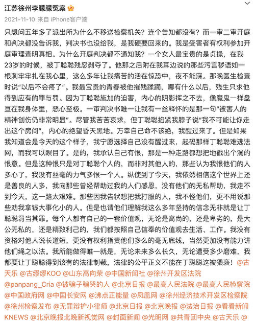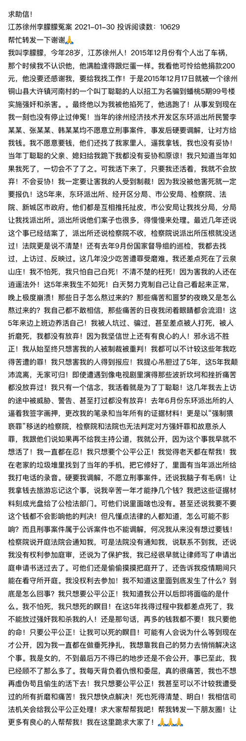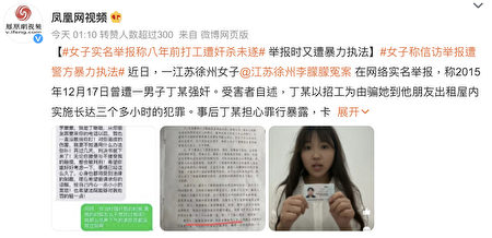 7月21日,凤凰网视频报导,近日,一江苏徐州女子、网名“江苏徐州李朦朦冤案”在网络实名举报,称2015年12月17日曾遭一男子丁某强奸。受害者自述,丁某以招工为由骗她到他朋友出租屋内,实施长达三个多小时的强奸犯罪行为。