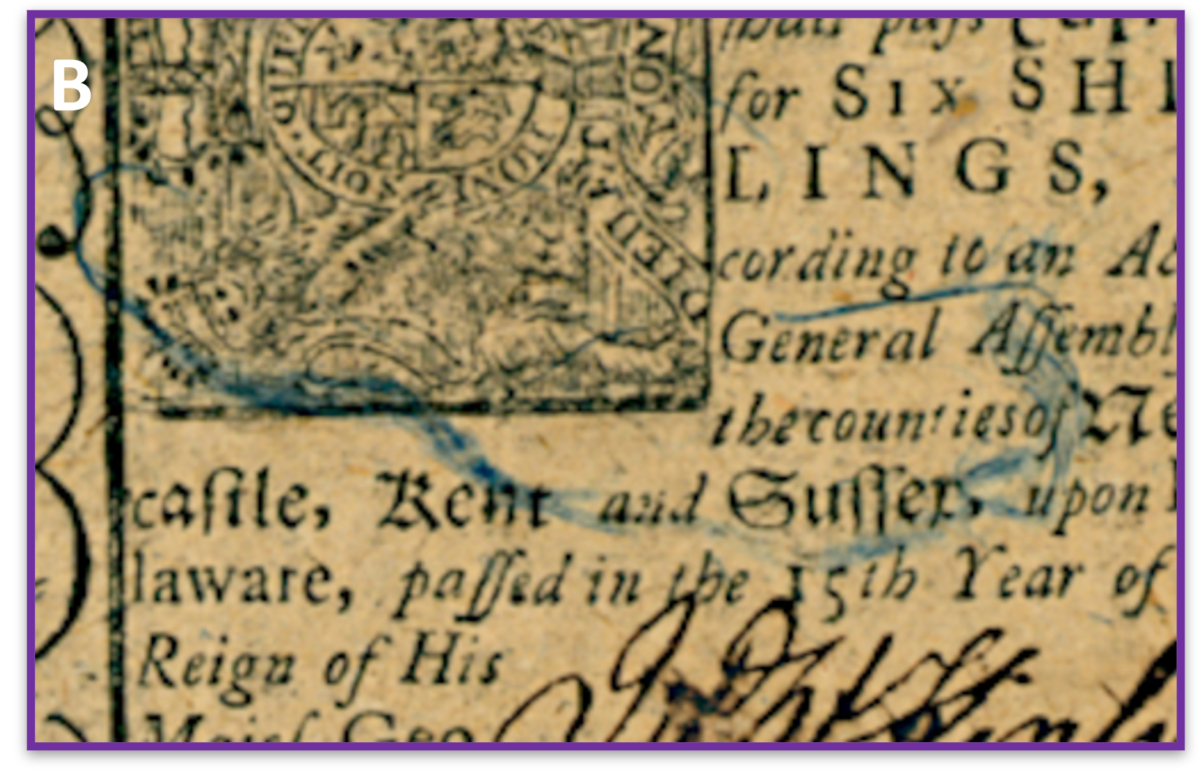 研究人员发现富兰克林喜欢在印刷钞票中加入水印、微小的靛蓝染色线和特殊水晶的“填充物”,以制造给造假者的困难。这篇论文还强调了富兰克林对“自然印刷”的使用,这是一种将树叶的详细脉纹图案转移到印版上的技术。