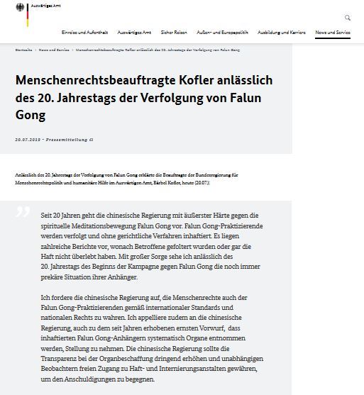 2019年7月20日,时任德国外交部人权专员考夫勒女士(Dr. Baerbel Kofler)在外交部网站上发表新闻公告,代表德国政府公开谴责中共当局对法轮功的迫害。