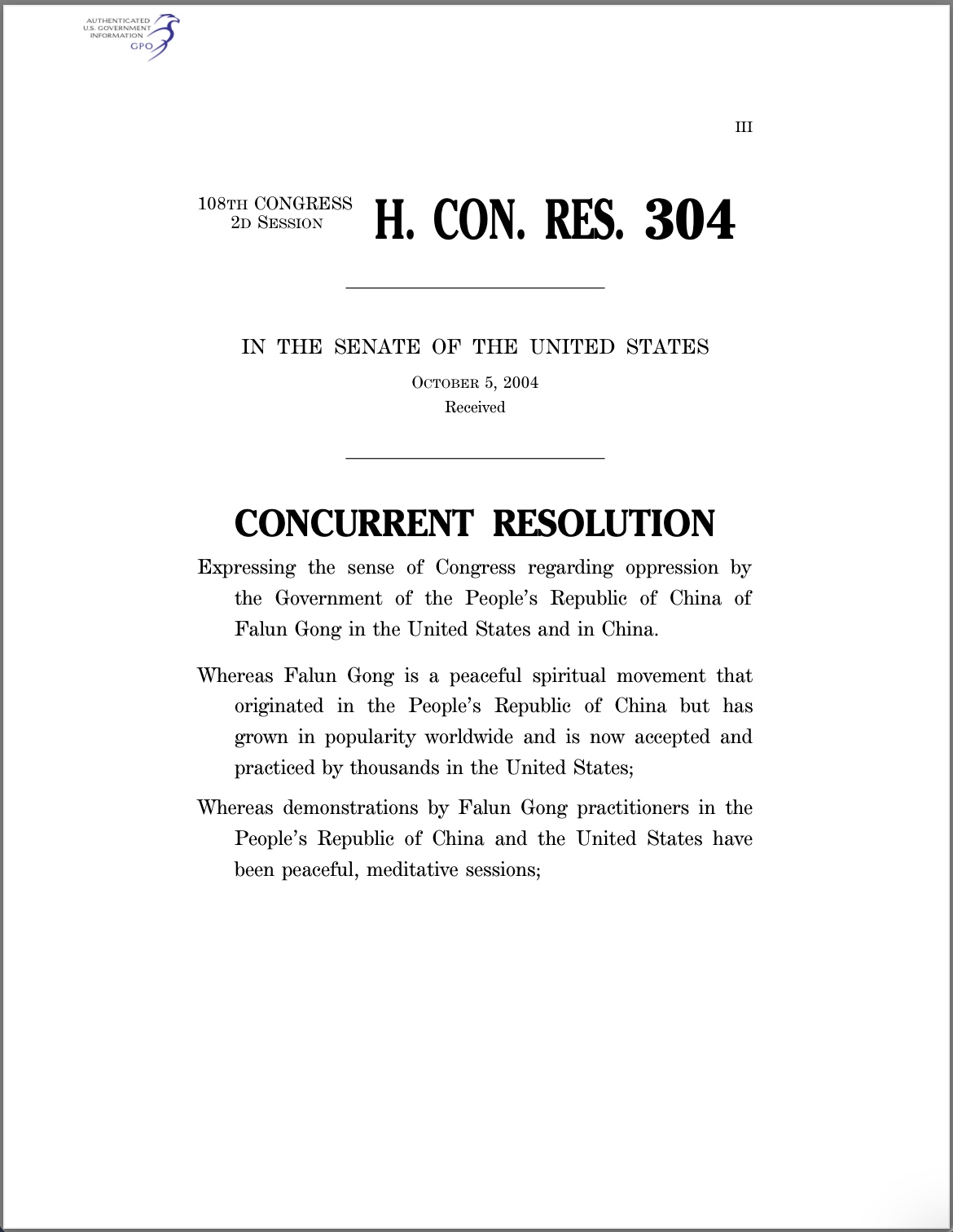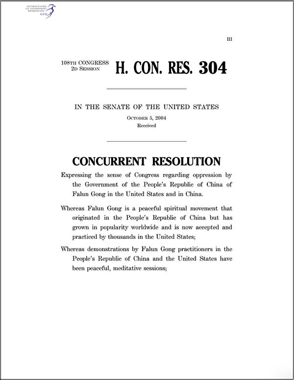 2004年10月4日,美国会全体通过304议案,要求中共停止在中国和美国迫害法轮功,释放所有在押的包括法轮功修炼者在内的良心犯。