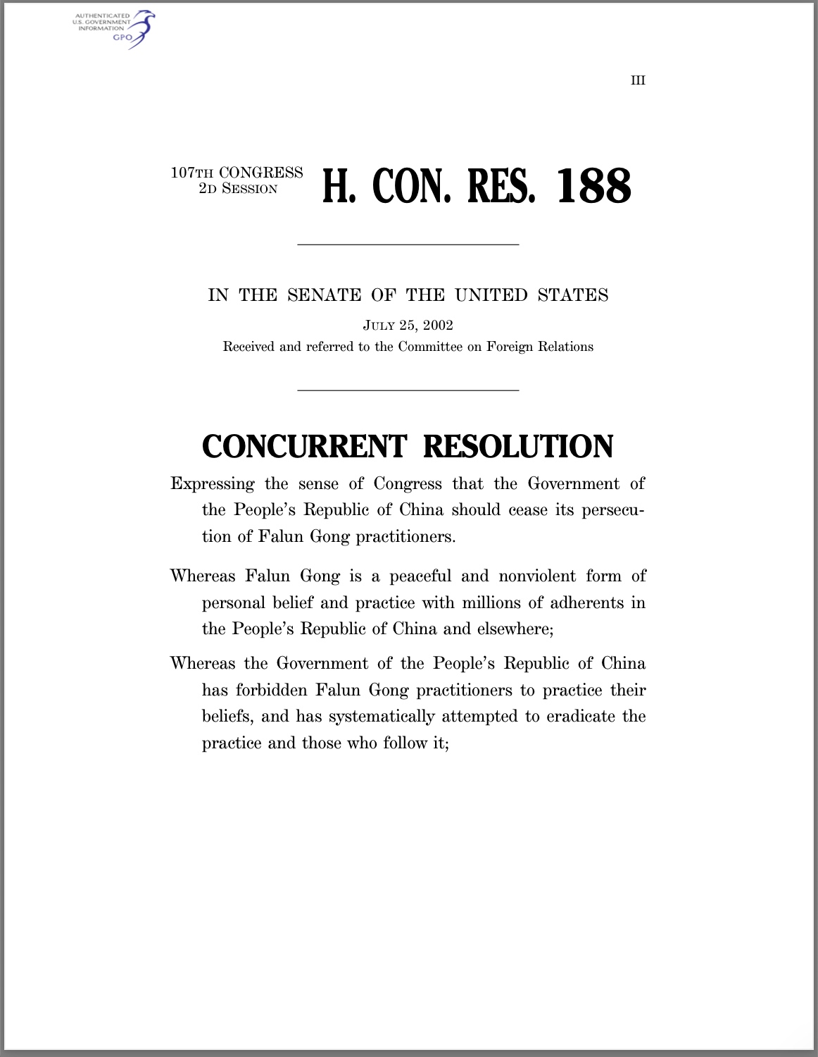 2002年7月24日,美国国会全票通过第188号决议 要求中国江泽民政府停止迫害法轮功修炼者,释放所有的法轮功修炼者。