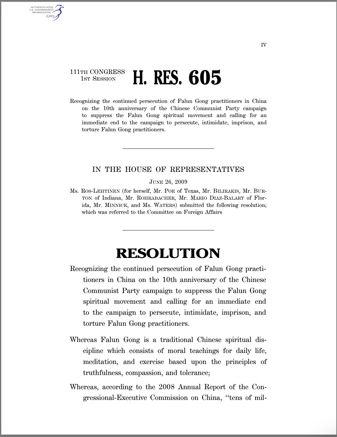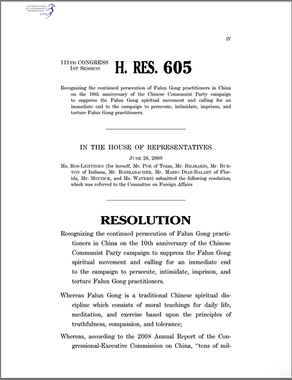 2010年3月16日,美国众议院全票通过第605号决议,要求中共立即停止对法轮功学员的迫害、胁迫、监禁及酷刑折磨,释放所有被关押的法轮功学员。