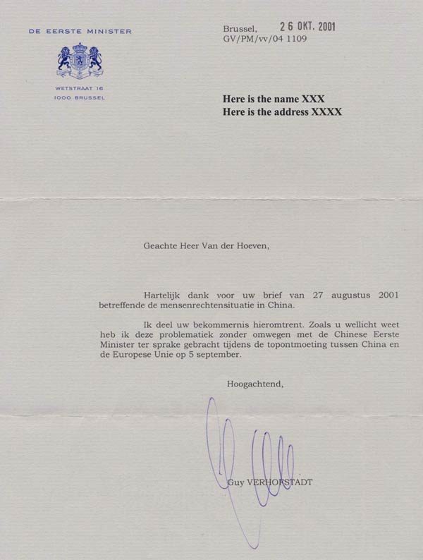 2001年10月26日,比利时总理致法轮功学员的支持信。