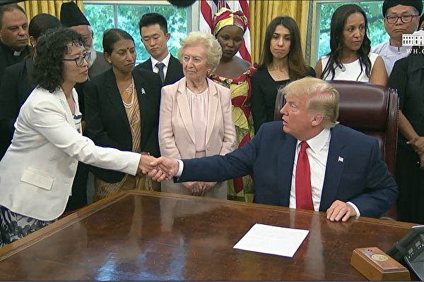 2019年7月17日下午,时任美国总统川普(特朗普)在白宫与来自中国、土耳其、朝鲜、伊朗和缅甸在内的17个国家的宗教迫害幸存者会面,其中包括法轮功学员张玉华。