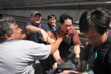 2002年4月11日中午,当江泽民车队到德累斯顿市达凯宾斯基酒店时,欢迎队伍中一女士高呼法轮功口号,被一中国保安冲上前去掐住脖子,几乎使她窒息。两名德国警官赶到,立即把这位妇女带出现场。