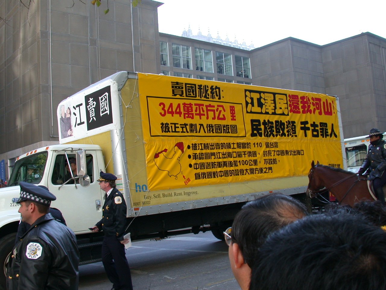 2002年10月22日,江泽民在芝加哥访问期间,被法轮功学员起诉,并由安保人员送达了起诉文书。这是海外法轮功学员控告江泽民的第一案。