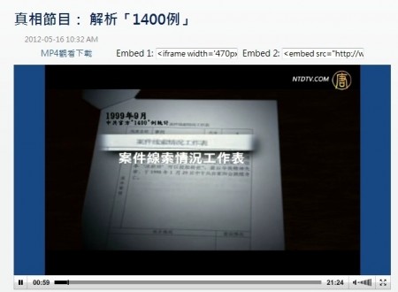 2012年5月15日,新唐人电视台播出了特别节目“解析‘1400例’- 诬蔑法轮功的‘1400例’真相”,其中曝光了一份来自中共高层的“绝密文件”,叫《案件线索情况工作表》。表格中提供了1,404名死亡者的线索,但没有证据,更没有查证,而且“查证情况”一栏全是空白。