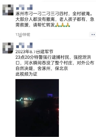 另有网传图片显示,“特警强行逮捕村民,强挖泄洪口,河水瞬间吞没了整个村庄,对外公布自然决堤,舍逐州,保北京。”
