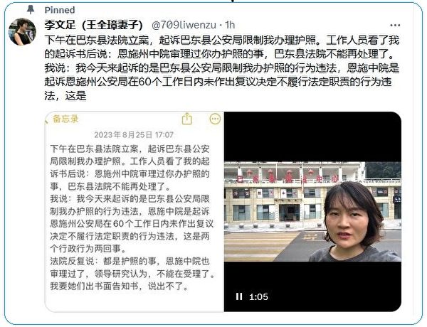 李文足24日在X平台(原推特)发视频说:“我回到湖北巴东老家了。今天上午到巴东县公安局办护照,窗口说不能办,是北京有通知不让办。 下午我来找局长,门卫说局长不在,局长又不是每天来办公室。 我去了信访接待室,前后来了四个人。卢主任说:限制我办护照的事是国保负责的。他主动打电话联系,让我明天到公安局3楼找国保队长。”(视频)