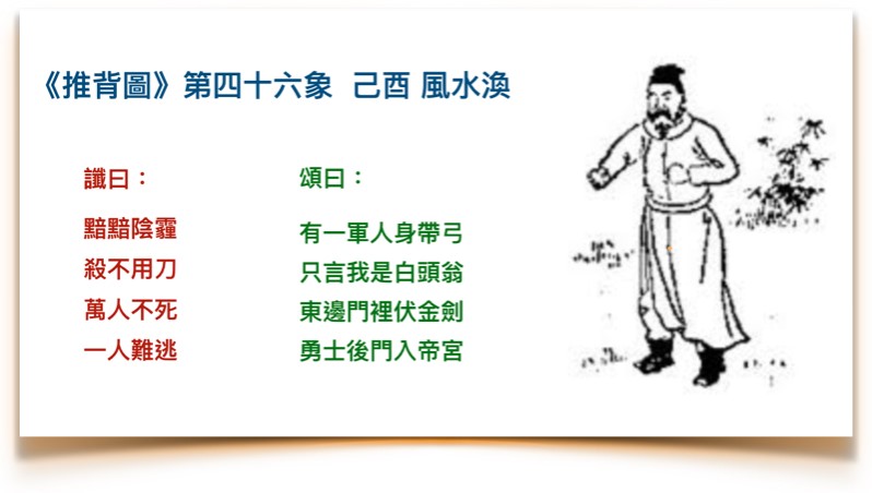 中国著名预言书《推背图》第四十六象,预示着当权者遇兵变身败:“谶曰:黯黯阴霾,杀不用刀。万人不死,一人难逃。”“颂曰:有一军人身带弓,只言我是白头翁。东边门里伏金剑,勇士后门入帝宫。”