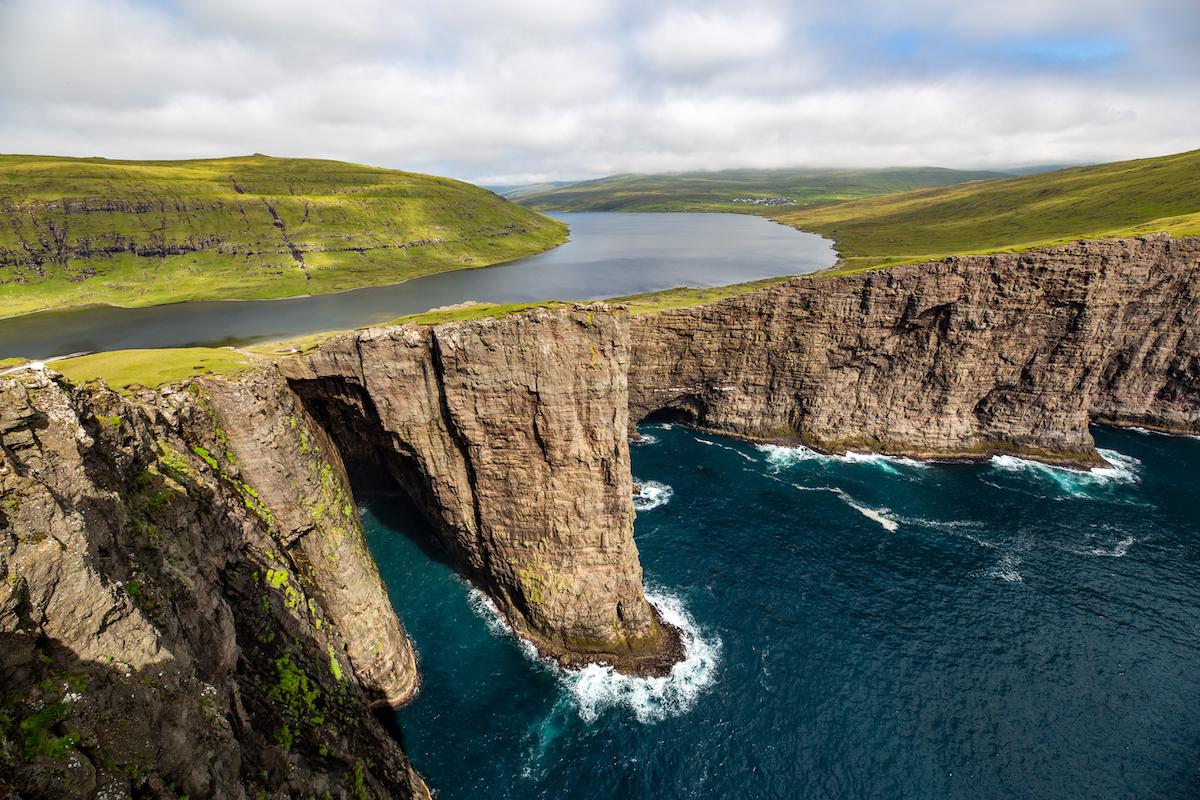 除了瑟沃格湖的美景外,令人惊叹的还有Bøsdalafossur瀑布,它从S形湖中喧嚣着冲入海洋。