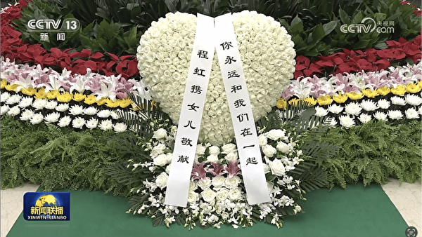 昨日(2日),在北京八宝山公墓的李克强灵堂中央,一个由白花插成的心形花篮上,写着:“你永远和我们在一起,程虹携女儿敬献”,但没有写女儿的名字。