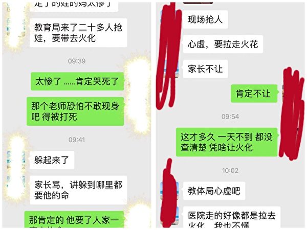 也有知情家长在网上披露说,走了的娃的妈太惨了,教育局来了二十多人抢娃,要带去火化。