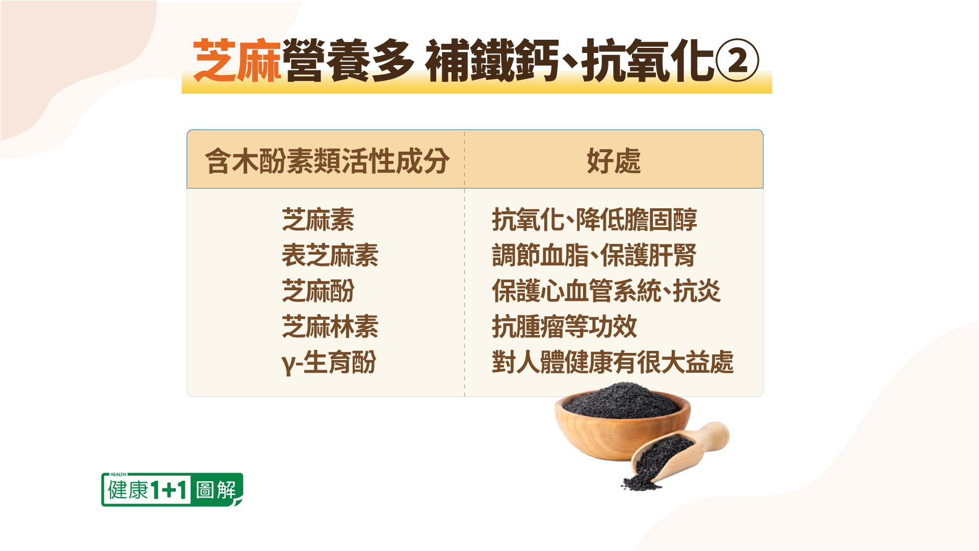 芝麻不仅富含油脂、蛋白质,还含有钙、镁、铁、锌、维他命B及木酚素等营养素,木酚素中的芝麻素有抗氧化、抗发炎、助睡眠等作用,受到人们关注。
