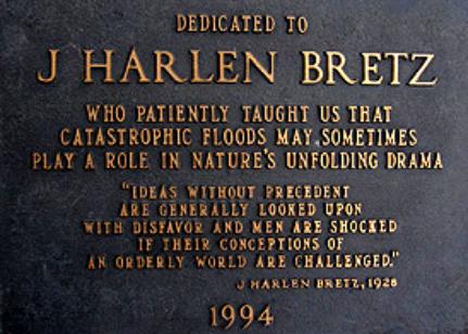 766. A plaque Archived 13 December 2013 at the Wayback Machine was dedicated to Bretz in 1994 outside the Visitor Center at Dry Falls State Park in Coulee City, Washington that reads “Dedicated to J Harlen Bretz who patiently taught us that catastrophic floods may sometimes play a role in nature’s unfolding drama”.