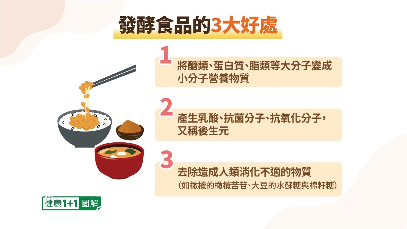 发酵食物是指食物经过发酵后,藉由微生物从大分子分解成小分子,是一个改变物质性质的过程,而执行转化的物质就是酵素。面包、馒头、酱油、优格、纳豆、味噌,甚至是臭豆腐,都是我们日常生活中常见的发酵食物。发酵食物对人体而言,至少有3个好处: