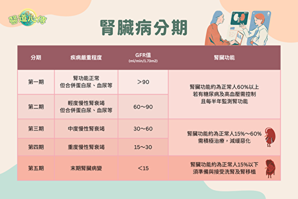• 第二期 GFR 60〜90。轻度慢性肾衰竭,但合并蛋白尿、血尿等。肾脏功能约为正常人60%以上,若有糖尿病及高血压需控制,且每半年监测肾功能。