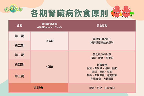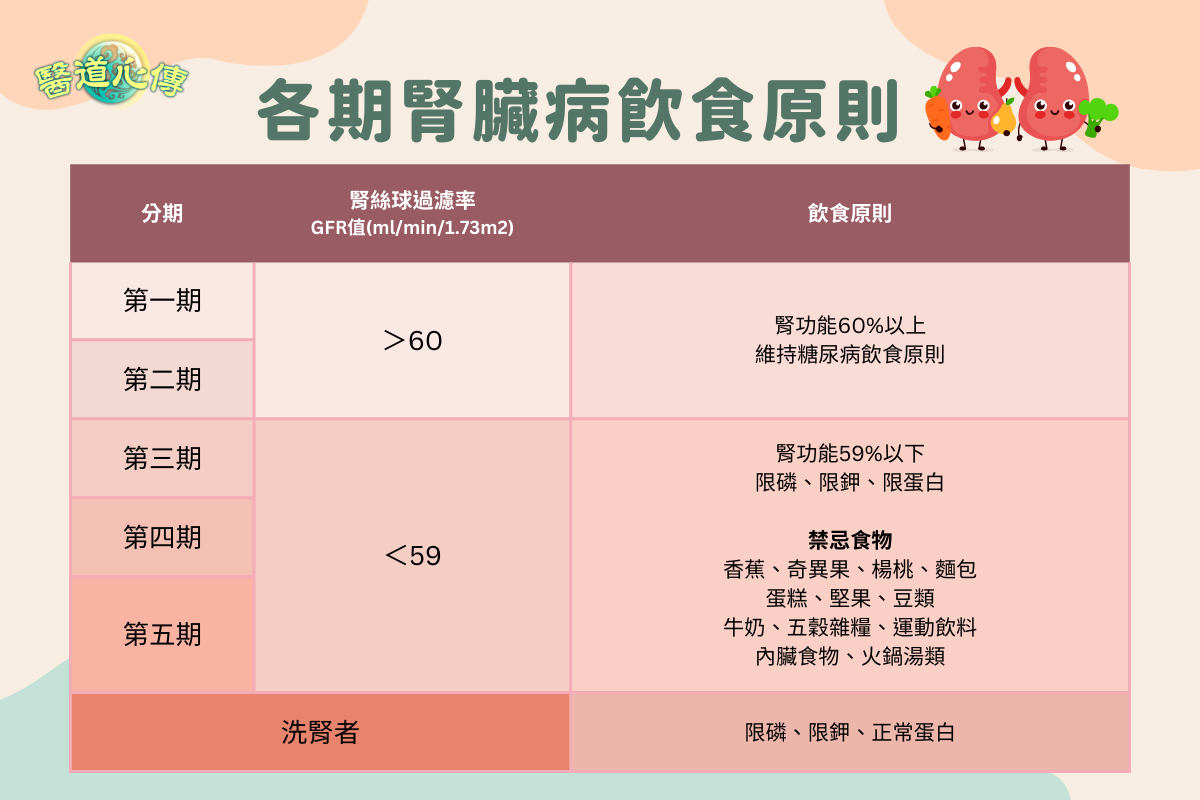 2. 第三、四、五期肾脏病:肾丝球过滤率<59ml/min/1.73m2,肾功能59%以下,限磷、限钾、限蛋白。
