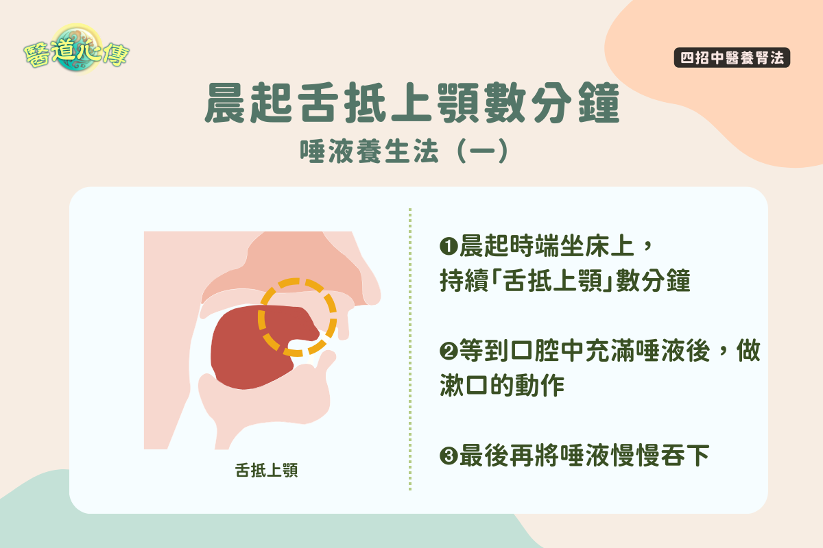 晨起时端坐床上,持续“舌抵上颚”数分钟,等到口腔中充满唾液后,做漱口的动作,再将唾液慢慢吞下。