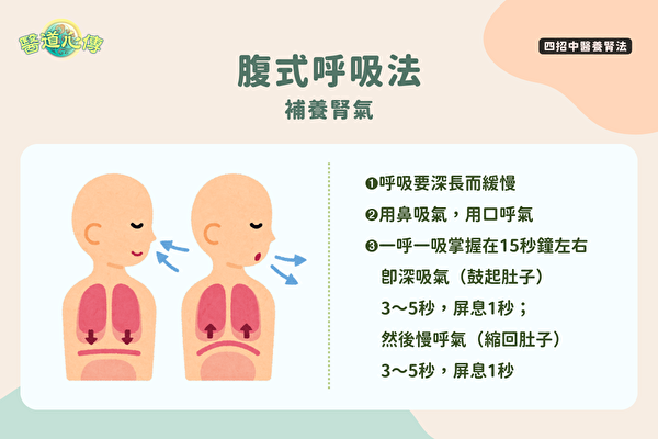 从足少阴肾经的循行来看,其直行者,从肾上行,穿过肝和膈肌,进入肺,沿喉咙,到舌根两旁。所以透过腹式呼吸法,可以让肺气从上向下沉到肾以补养肾气,这也正符合了五行中肺金生肾水的概念。