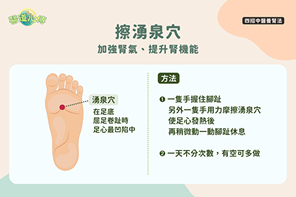 足底的涌泉穴为肾经的重要穴位,经常按摩可以补养肾的能量、提升肾机能。