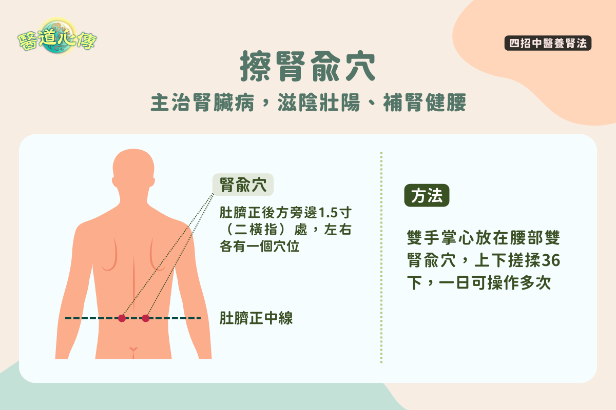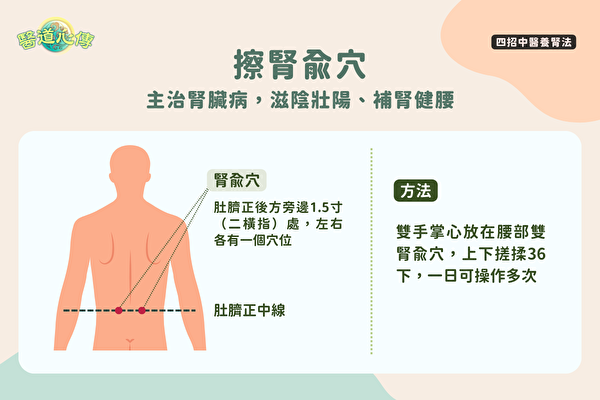 方法:双手掌心放在腰部双肾俞穴,上下搓揉36下,一日可操作多次。