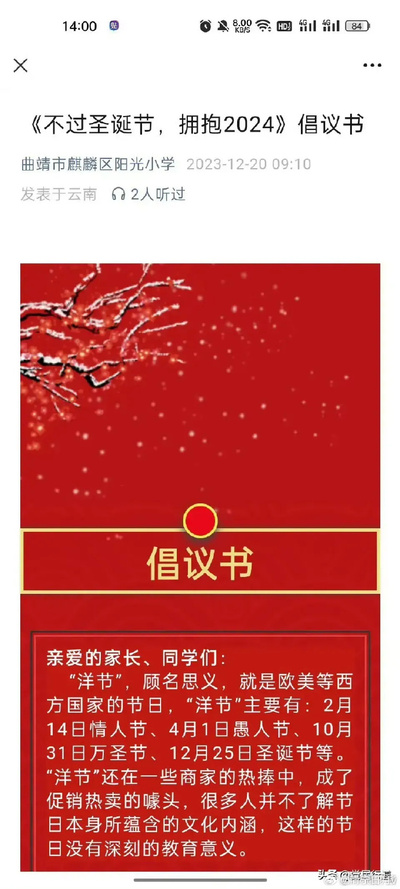 截图显示,12月20日,云南曲靖市麒麟区阳光小学发出一份《不过圣诞节,拥抱2024》倡议书。