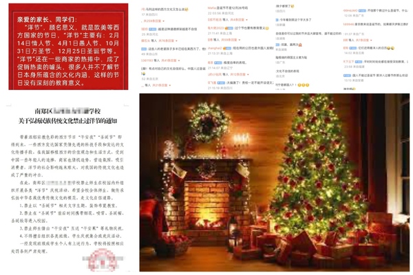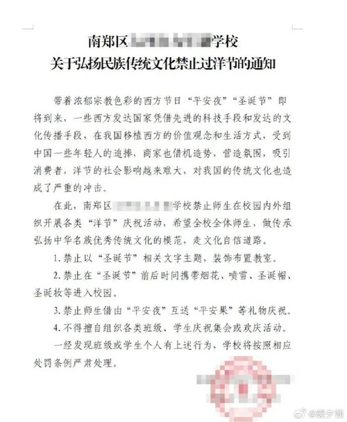 通知内容大致为,带着浓郁宗教色彩的西方节日“平安夜”“圣诞节”即将到来,一些西方发达国家在中国移植西方的价值观念和生活方式,受到中国一些年轻人追捧,洋节的社会影响越来难大,对“传统文化”造成严重冲击。