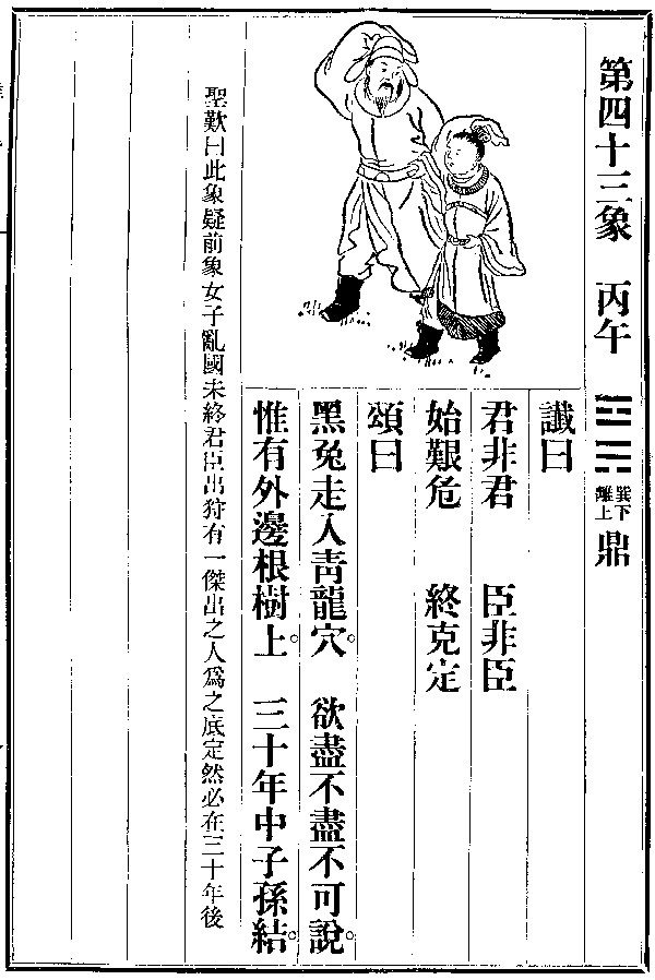 当历史进入预言中的2023与2024年的交际时刻,回溯中共与中华民国过往之历史与古今之预言,不难发现早在千年前《推背图》中,袁李二人已然洞若观火,将复兴中华文化之希望与未来之景隐示于第43象图谶中。2023癸卯年是兔年,因天干癸属水,色黑而为黑兔,2024甲辰年是龙年,天干甲木,以青色为代表,诗颂“黑兔走入青龙穴”即将时空锁定在历史由2023进入2024年之关要,正值台湾大选之际。配图中西北位之大人指代中国大陆之中共政权,东南位身着官服之小孩则为退守台澎金马之中华民国,从空间尺度上对应海峡两岸之现实。大人目光紧盯小孩,映照中共对台湾虎视眈眈,中华民国的存在一直是中共之心病,中共时刻关注着台湾的一举一动。小孩目光直视前方,泰然向前迈步则对应了台湾无惧中共胁迫,稳步走自己的道路。大人做抬手攻击状映照中共对台湾武力威胁,小孩抬手做防御状则对应了中华民国政府以武装防卫台湾。小孩身着华丽官服表明中华民国实际控制范围虽小,却是中华正朔。