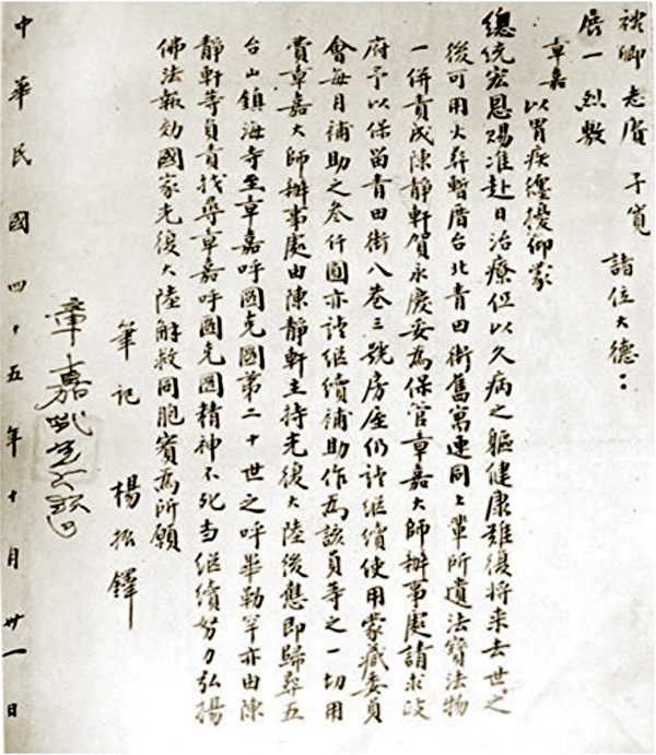 除了世上流传颇广之主流预言,深谙天象的第七世章嘉大师在圆寂前曾表明自己在光复大陆前将停止转世,待中华民国光复大陆后乘愿再来,尔时蒙藏委员会后人应携法器赴五台山镇海寺寻找下一世转世灵童,纪录者将之列入大师遗嘱,成了鲜为人知的谶言。