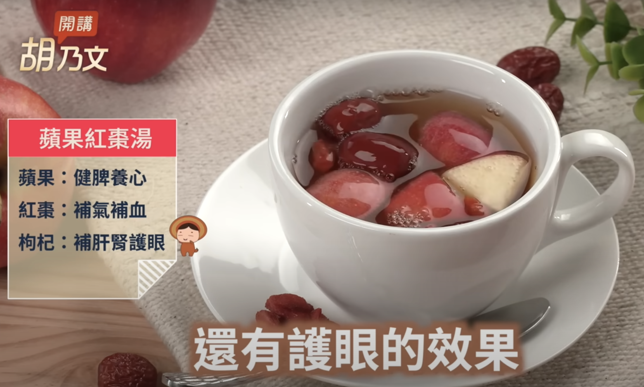 “苹果红枣汤”有调理肠胃、降胆固醇的功效。红枣补气血,枸杞能够补肝肾、护眼。冬天再加几片姜片还可以驱寒保暖,整体效果更好。